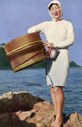 まず、大田洋子の「海女」。昭和14年1月『中央公論』2月号に発表され、「知識階級総動員懸賞小説」の一等に入選。先行研究によれば「地方の生産を高めようとする国策に沿ったもの」として評価されたという。 恋人と都会で暮らした若い海女テルは失意のすえに帰郷し、再び海女として生きる事を選ぶ。温かく受け入れてくれる旧知の人々の中で、様々な仕事の実際を見聞きしながら、海女として長年働き続けた双子の姉と見紛うほどに逞しく成長して行く。海藻やアワビなどの獲物採取から水産物加工、鰯の水揚げ作業と四季を通じた海女の労働はその及ぼす経済効果も大きく、それが国家のため、つまり、この時代にあっては銃後の務めとして賛美された。抑圧や搾取といったネガティヴな要素と無縁な勤労のアイコンとして海女の姿が文芸作品に登場した初期の事例といえるだろう。小説の舞台となった丹ヶ浦は現在のいすみ市大原で、岩瀬禎之写真集『千葉御宿1931-1964』(2002年 透土社)の撮影地御宿に近い。